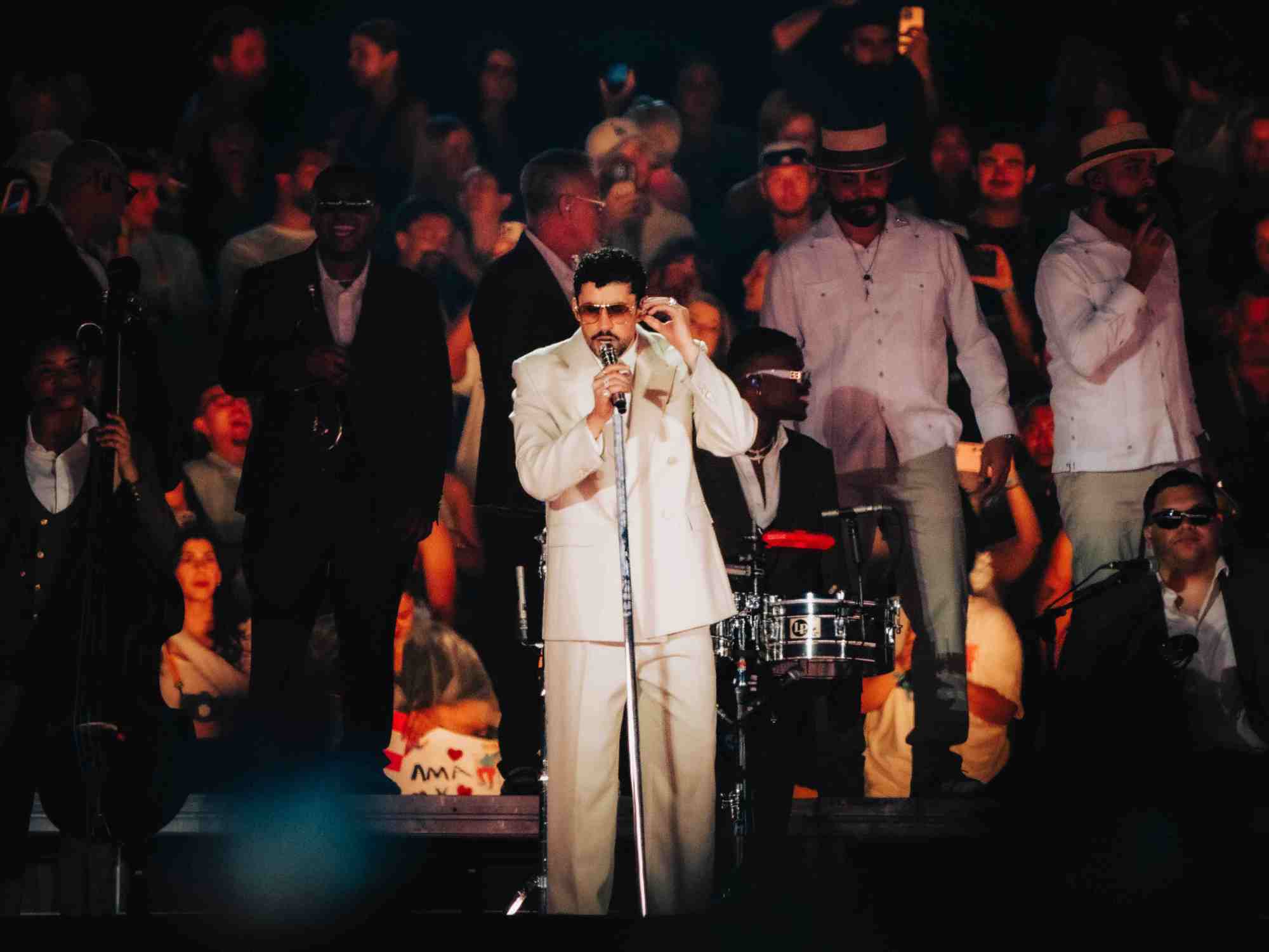 As the clock struck eight, ENGIE Stadium descended into darkness. A shadow cut a lone figure on the stage. Then, in a flash, the floodlights burst into action illuminating the man in a suave, perfectly manicured, white suit to pure pandemonium from the audience. Bad Bunny had arrived in Australia.