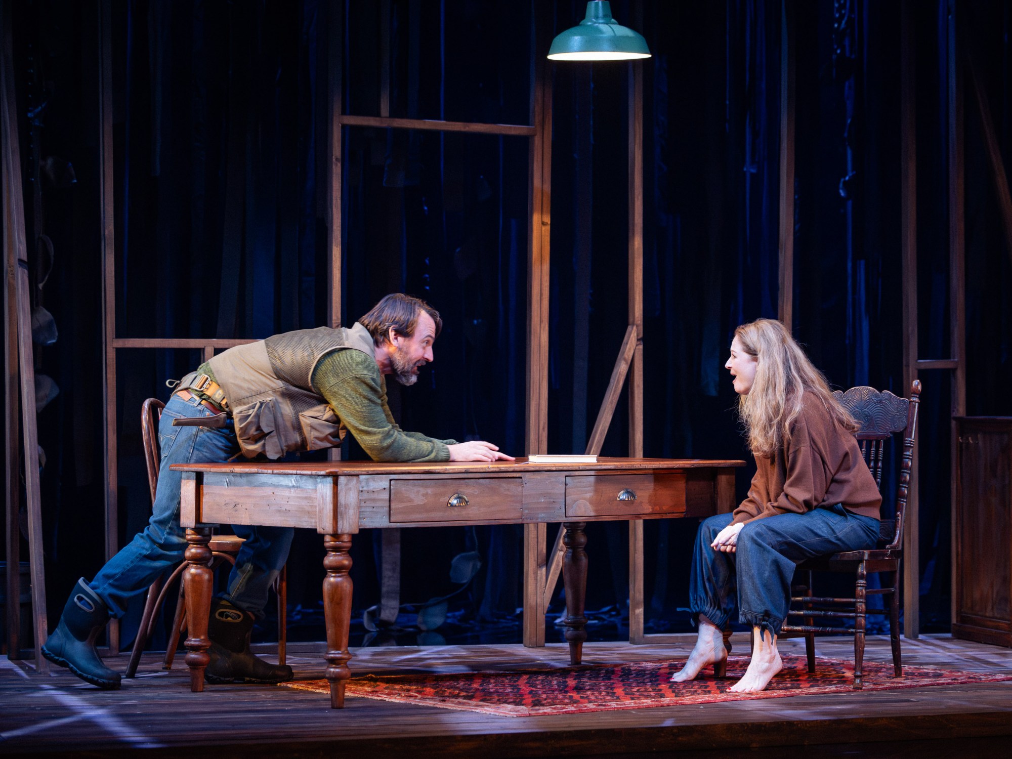 The play focuses on the life of the Man (played by Ewan Leslie) who loves fishing and is out in an outback cabin where he brings two women (Miranda Otto and Andrea Demetriades) to whom he tells basically the same stories and provides the same experiences. It is not quite clear what the man’s intentions are but he takes both women out to the lake to fish despite one woman’s later protestations about fishing and eventually begins to tell them stories about his life and invites them to share their stories as well, although they ultimately lead to the same outcome.